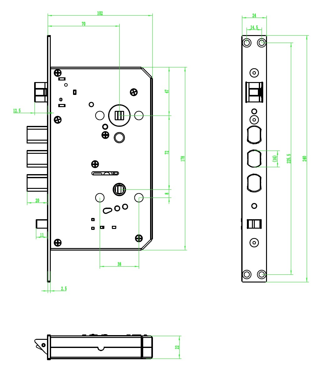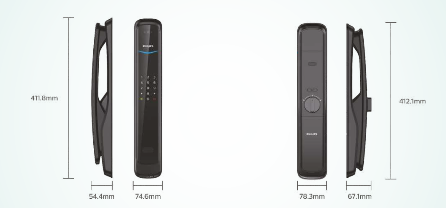 Размеры наружной части замка (ШхВхТ) ~ 74,6х411,8х54,4 мм